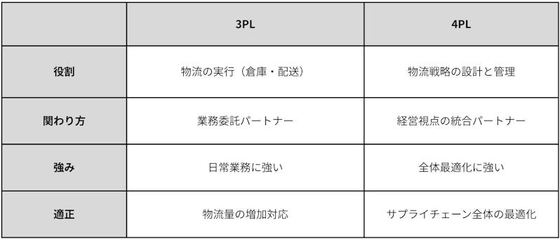 3PLと4PLは、企業の物流を支える仕組みという点では同じですが、関わる深さが大きく異なります。