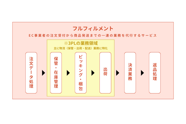 一見、「発送代行」や「3PL(サードパーティ・ロジスティクス)」と似ていますが、フルフィルメントはそれらよりも広い意味をもち、顧客体験の品質までを視野に入れた物流支援を特徴としています。